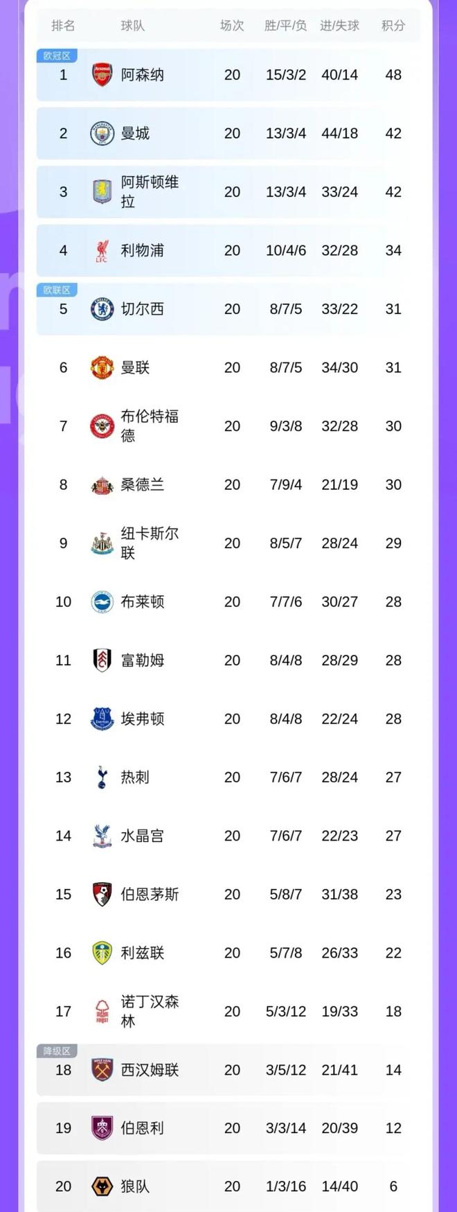 目前英超前6排名:阿森納領跑,曼城緊隨其后,阿斯頓維拉和利物浦分列3、4,切爾西、曼城位列第5和第6名。降級區方面:西漢姆聯、伯恩利和狼隊分列18、19和20名。